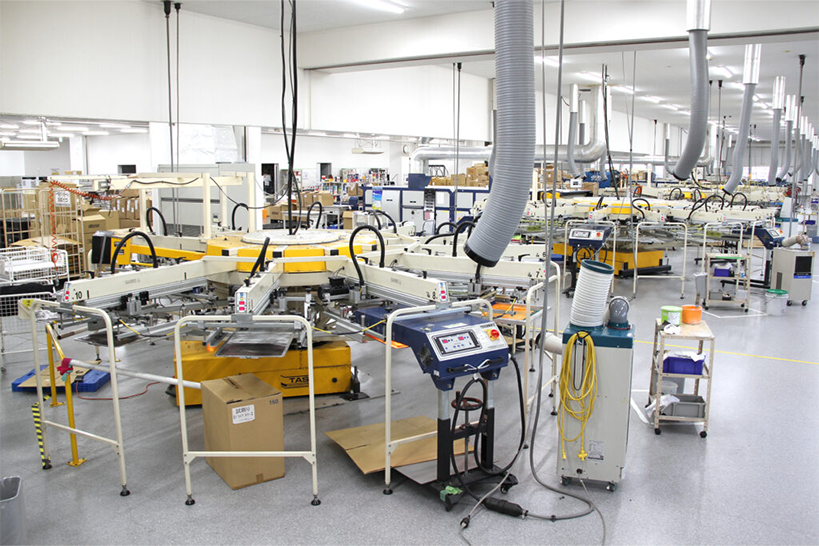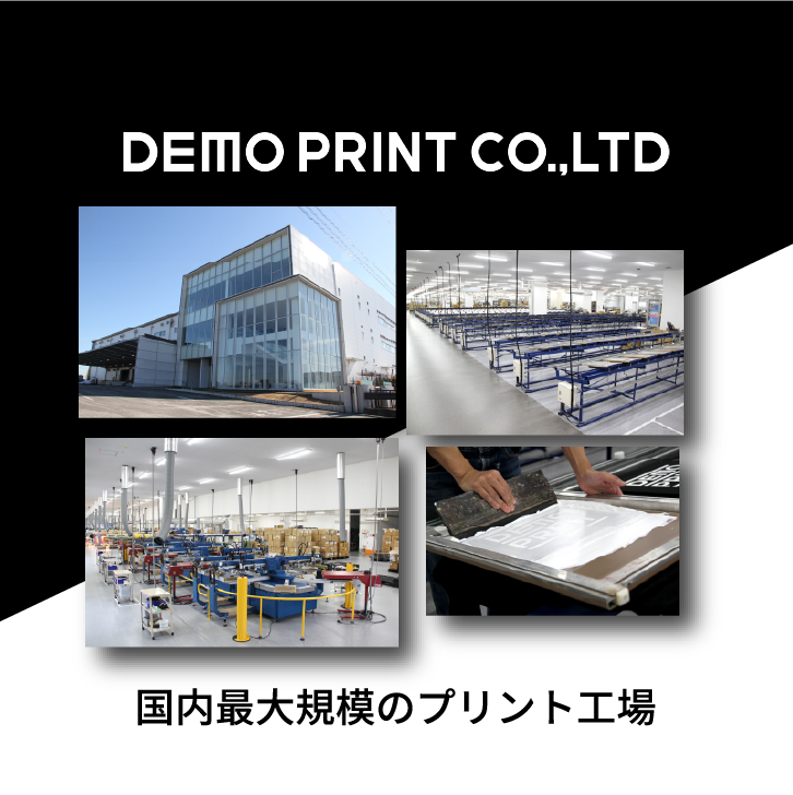 DEMO PRINTは約6,500㎡の日本最大規模を誇るプリント加工エリアを有しています。広さを活かした大量ロットの生産と多様なプリント加工への対応、そして清潔且つ安全な作業環境を生み出すことで安定した生産を実現しています。